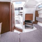 As grandes janelas coloridas oferecem vistas deslumbrantes do mar, mantendo o interior bem iluminado e ventilado. O salão é elegante e prático e os acessórios internos do ANTARES 8 incluem uma área de cozinha com geladeira e opção de fogão a gás ou elétrico. O ANTARES 8 também pode ser equipado com ar-condicionado, ideal para refrescar o barco durante os períodos de calor quando atracado e mesmo no mar, devido às suas potentes baterias de lítio.