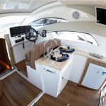O estilo esportivo da embarcação fica por conta do “hard top”, uma espécie de teto-solar com abertura de bordo a bordo por meio de acionamento elétrico, sem abrir mão da elegância e do design arrojado. O modelo conta ainda com plataforma submergível, opcional, e confortáveis degraus de acesso.