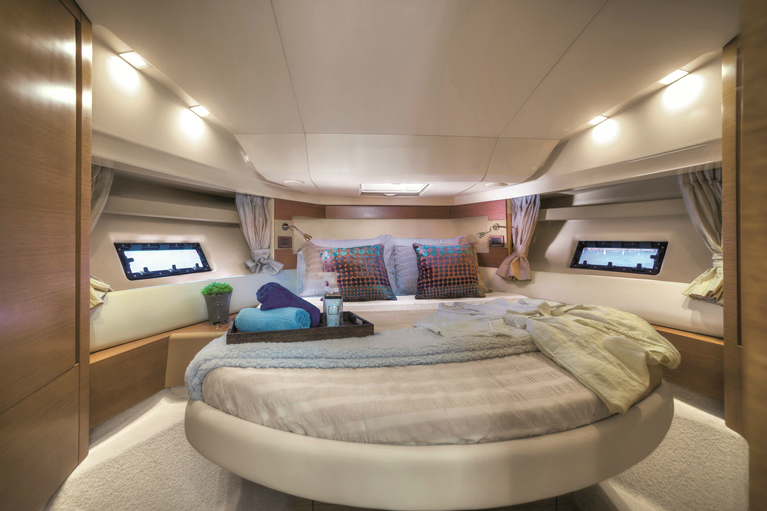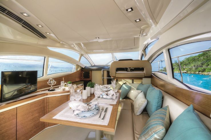 Para agradar o público latino-americano, o iate de 42 pés possui um amplo salão principal com grandes janelas que privilegiam a iluminação natural e traz uma mesa de jantar removível (que também é dobrável) e que pode ser utilizada na praça da popa.