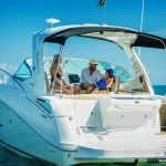 Já a Sea Ray 395 Sundancer, possui amplas janelas fixas no casco que garantem luminosidade natural. O solário de proa foi privilegiado com colchonetes de apoio adicional, espaço gourmet com grill elétrico, e assentos giratórios que facilitam a socialização e navegabilidade da embarcação.