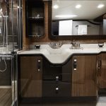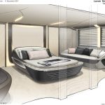 Nuvolari Lenard perseverou na criação de uma representação realista de curvas semelhantes a carros, e com grande efeito – talvez seja melhor exibido na cabine principal no andar inferior. Aqui, a cama king-size apresenta uma base curva e flutuante e cabeceira arredondada para transmitir a sensação de estar em um casulo, semelhante à cabine de um carro. A mesa, a espreguiçadeira e a porta ecoam as curvas e as bordas arredondadas, resultando em uma atmosfera relaxante.