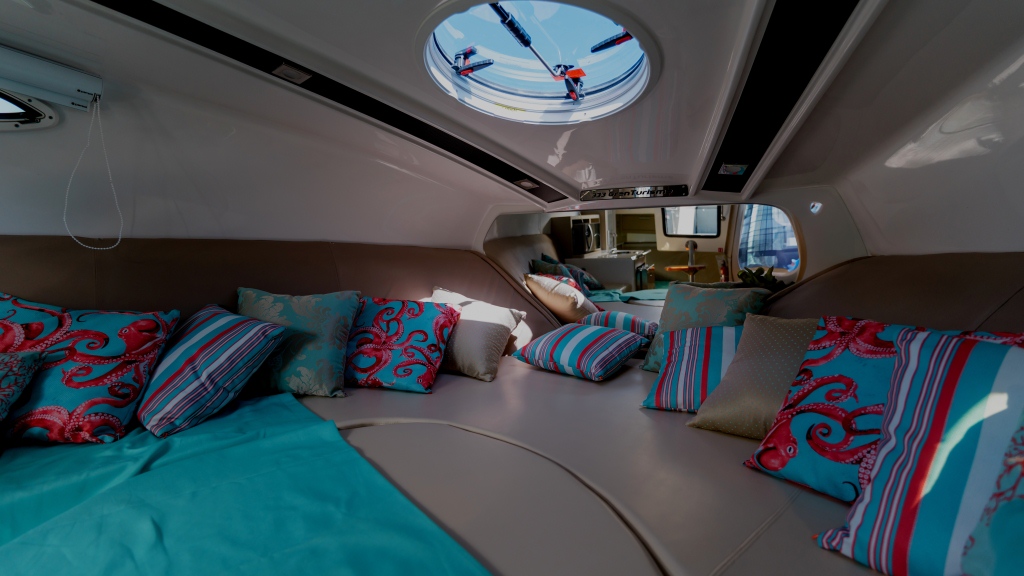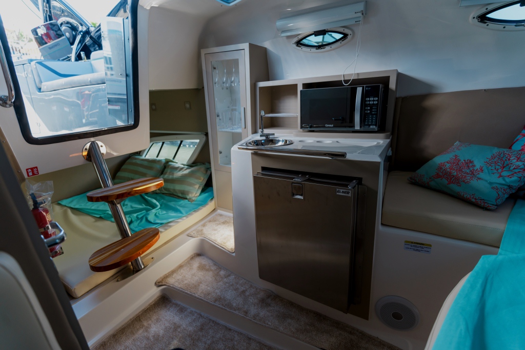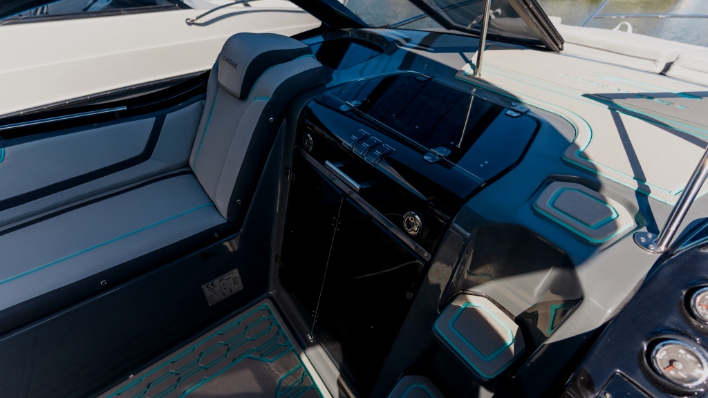 Entre os diferenciais do barco estão: “T-Top” com iluminação em LED (similar ao teto-solar com acionamento elétrico); iluminação em LED por todo o barco; painel de comando superesportivo; e acabamentos em fibra de carbono e inox.