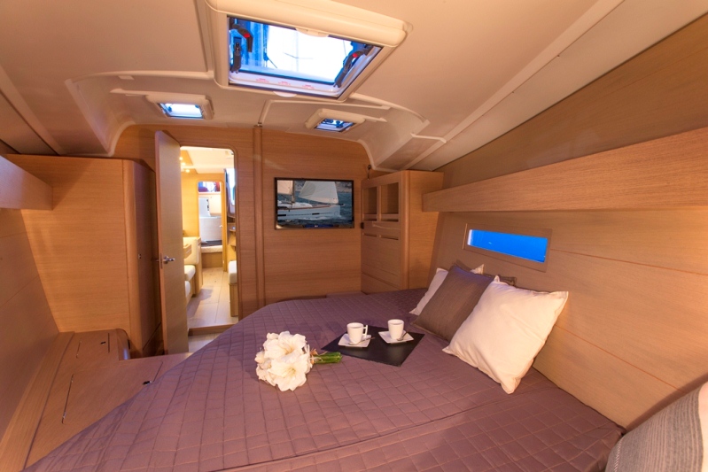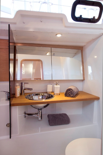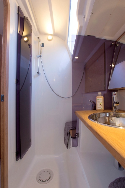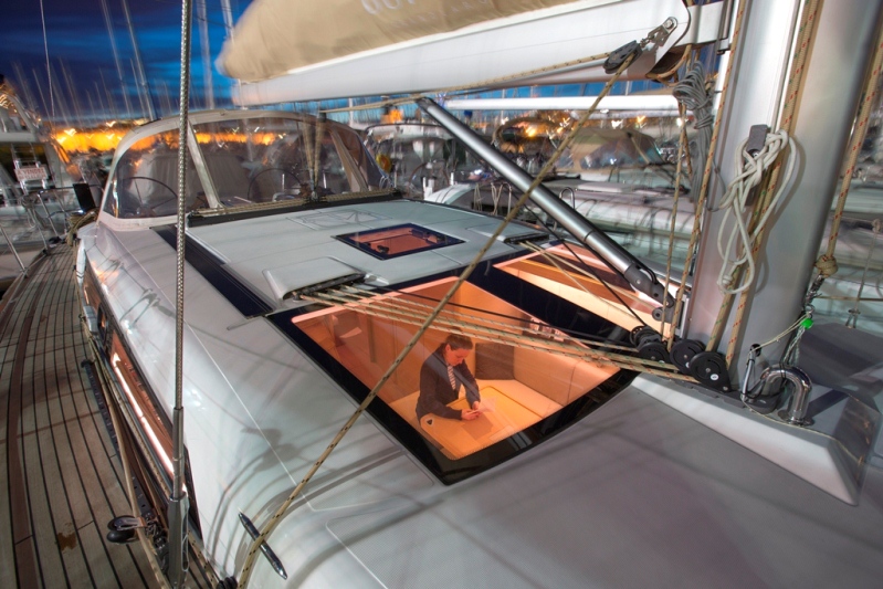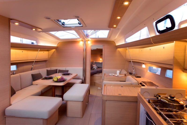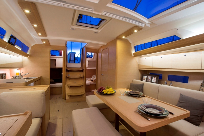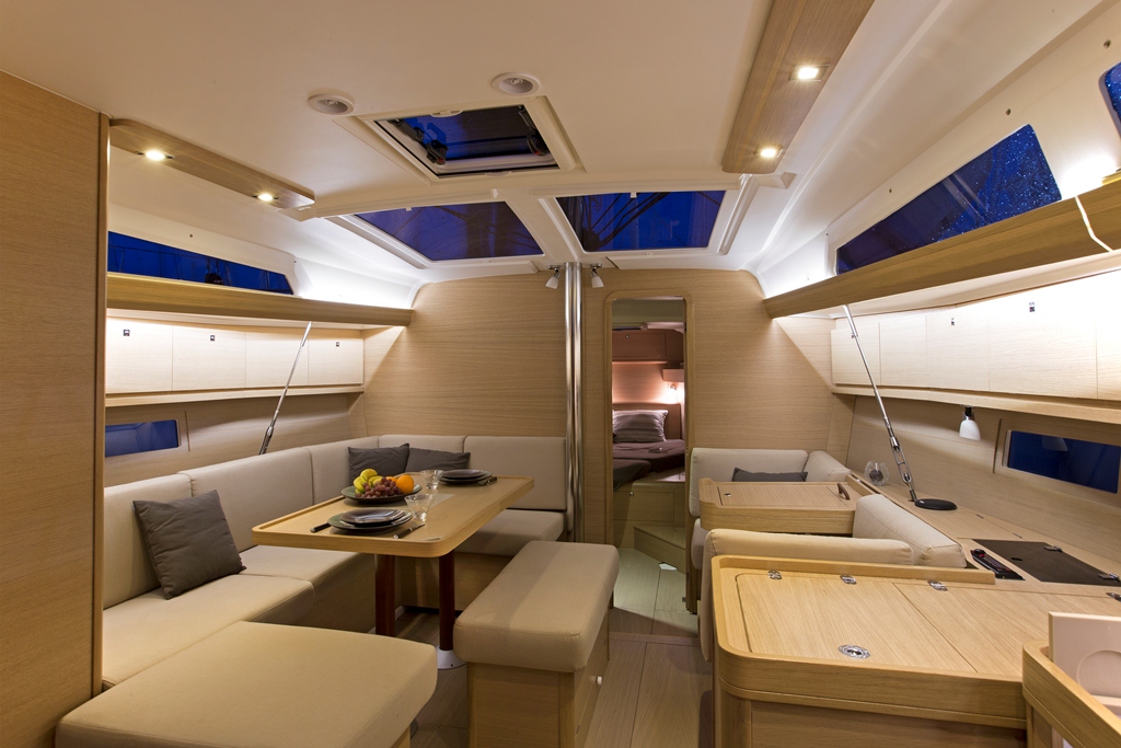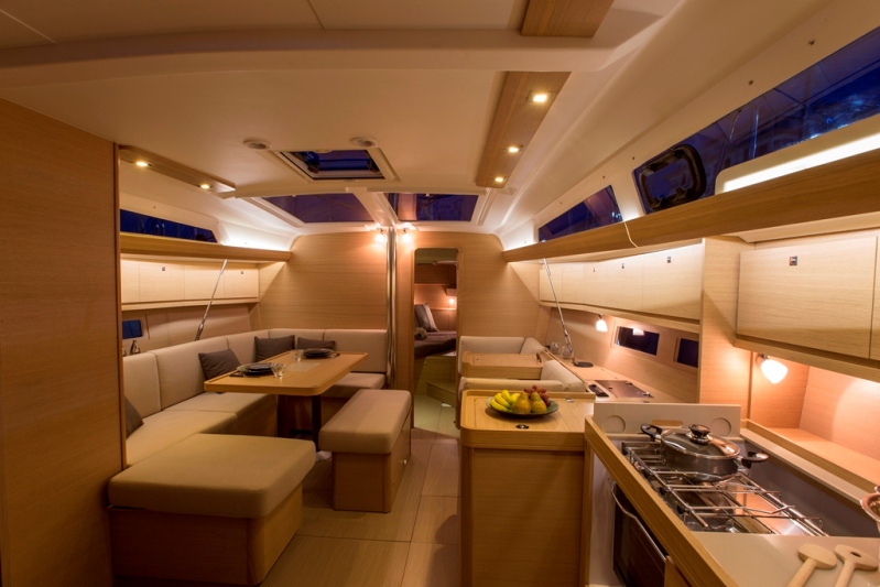 Com escotilhas modernas e leves, a iluminação interna aproveita muito da luz natural, recurso pouco utilizado em veleiros. O salão tem Iluminação discreta de LED.