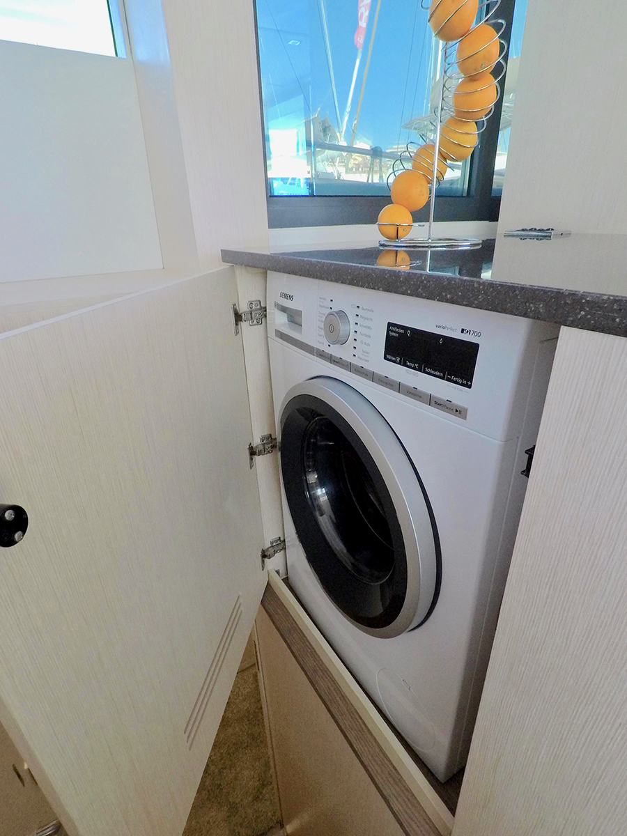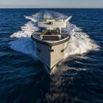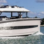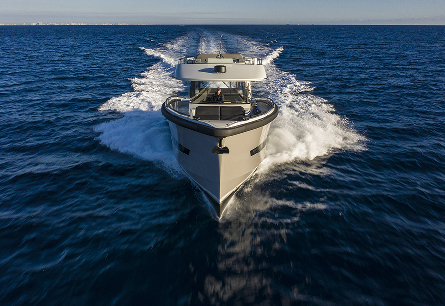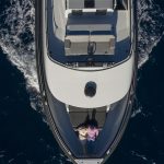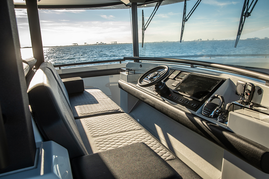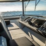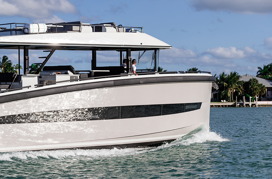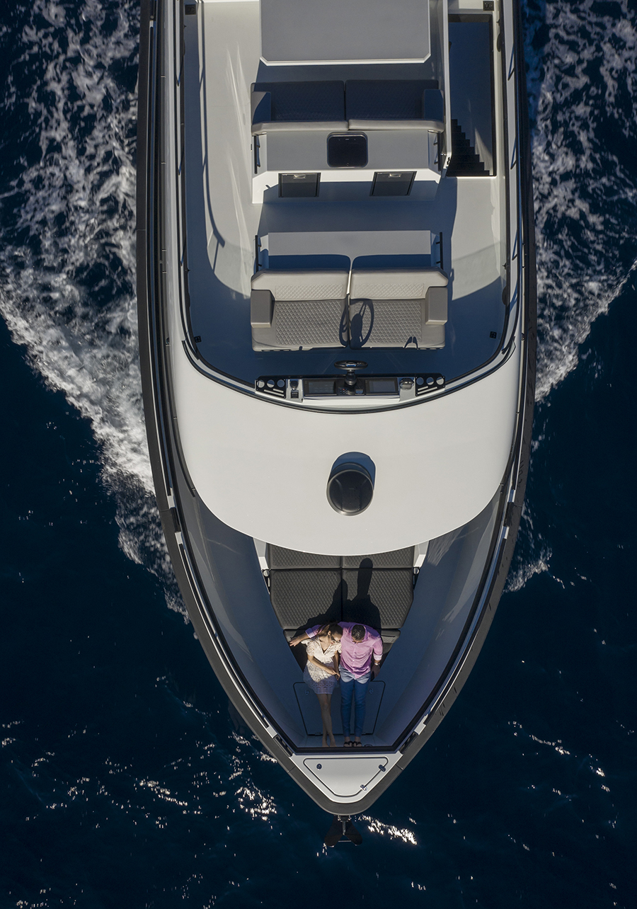 O vasto espaço de convés na linha d’água se presta a todos os tipos de usos, desde a plataforma de pesca ao espaço de socialização, até o local de estiva para brinquedos e embarcações. Para os lados da área do convés, dois grandes bancos escondem unidades de armários que fornecem armazenamento para equipamentos de esportes aquáticos e outros itens, em uma escala praticamente inédita nesta categoria de tamanho de iate.