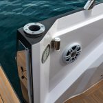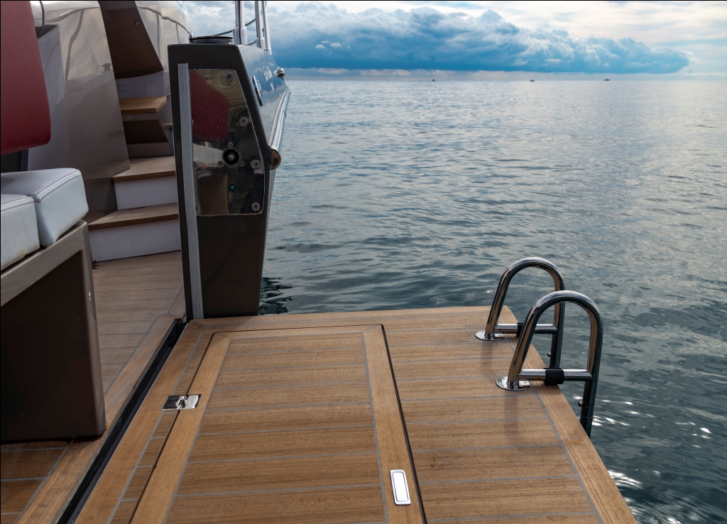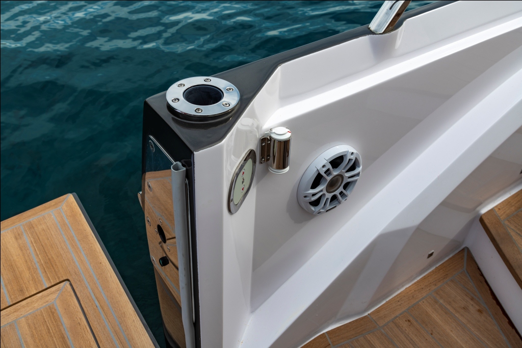 No convés externo, a mobilidade é garantida pelo espaçoso console central e pelo sofá em formato “L”, proporcionando uma circulação fácil e acessível a todos os ambientes. Destaca-se também o sistema de cobertura inovador, com um toldo removível discretamente guardado na proa.  Equipada com motorização de popa de até 350 HP, a KL27 oferece um desempenho excepcional, combinando estabilidade, facilidade de manobra e eficiência de combustível.