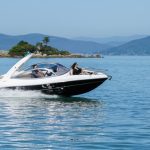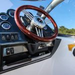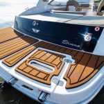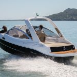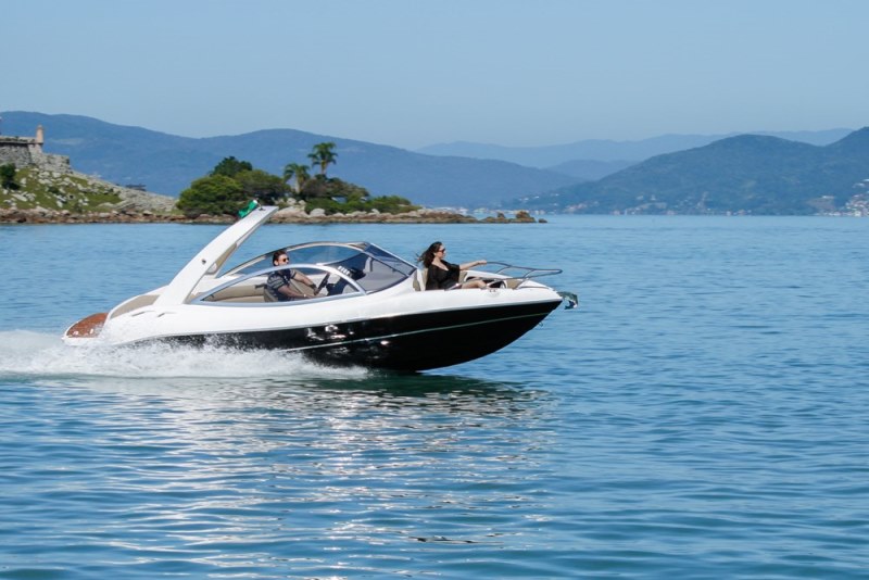 Sua targa de fibra invertida, característica das FS Yachts, impressiona por aumentar o porte da embarcação, e ainda oferecer uma área maior de sombra na embarcação com o toldo aberto.