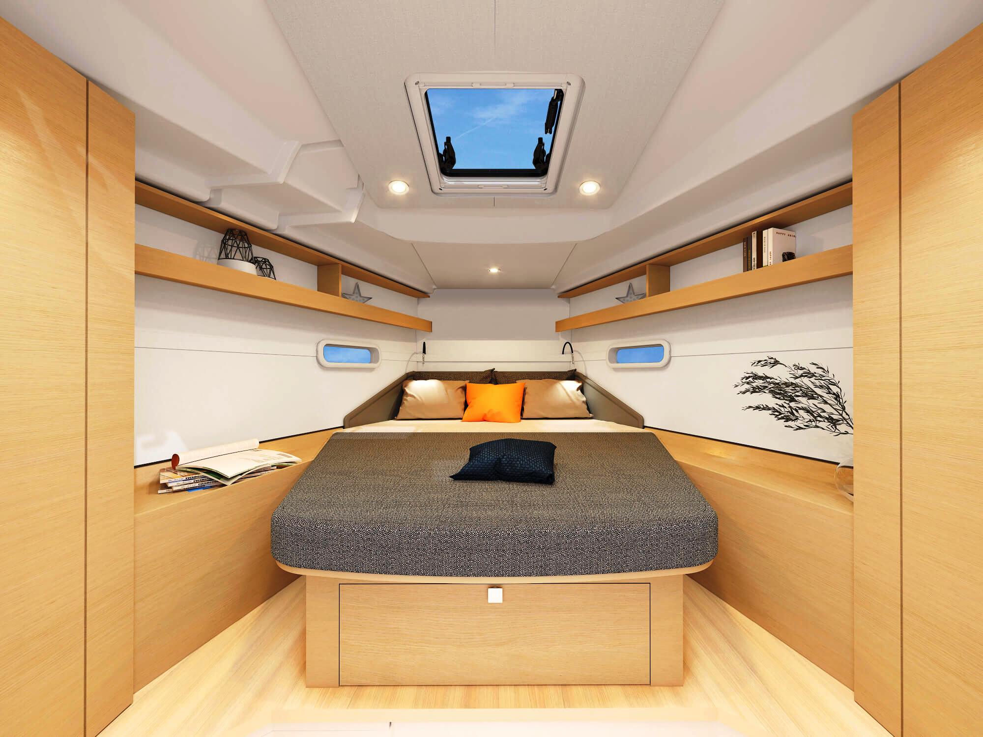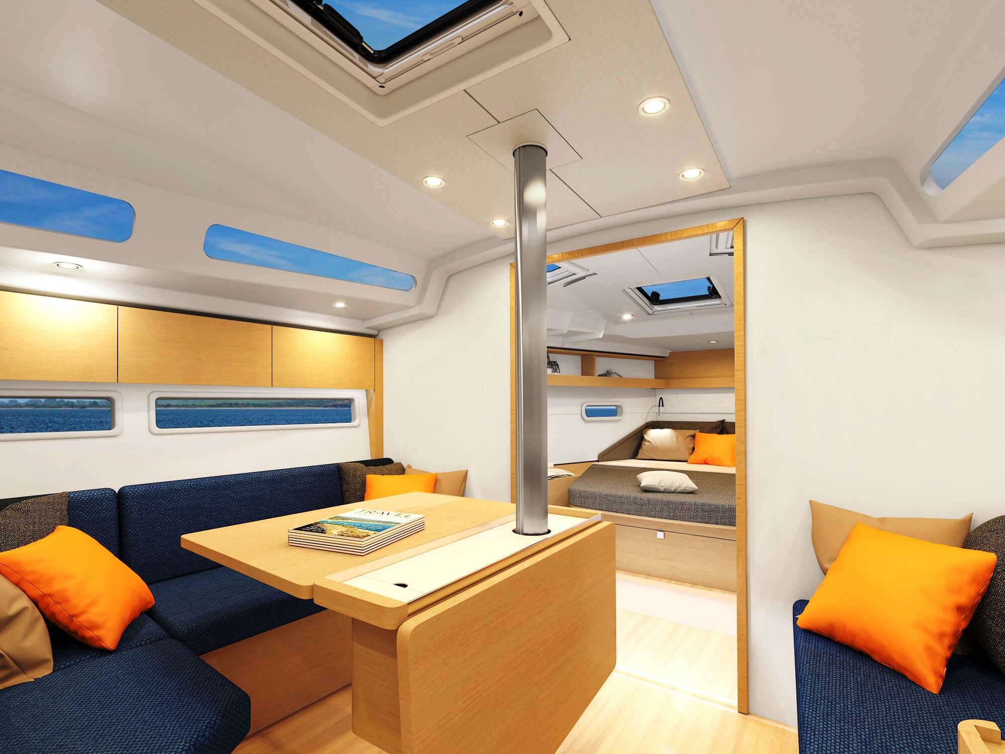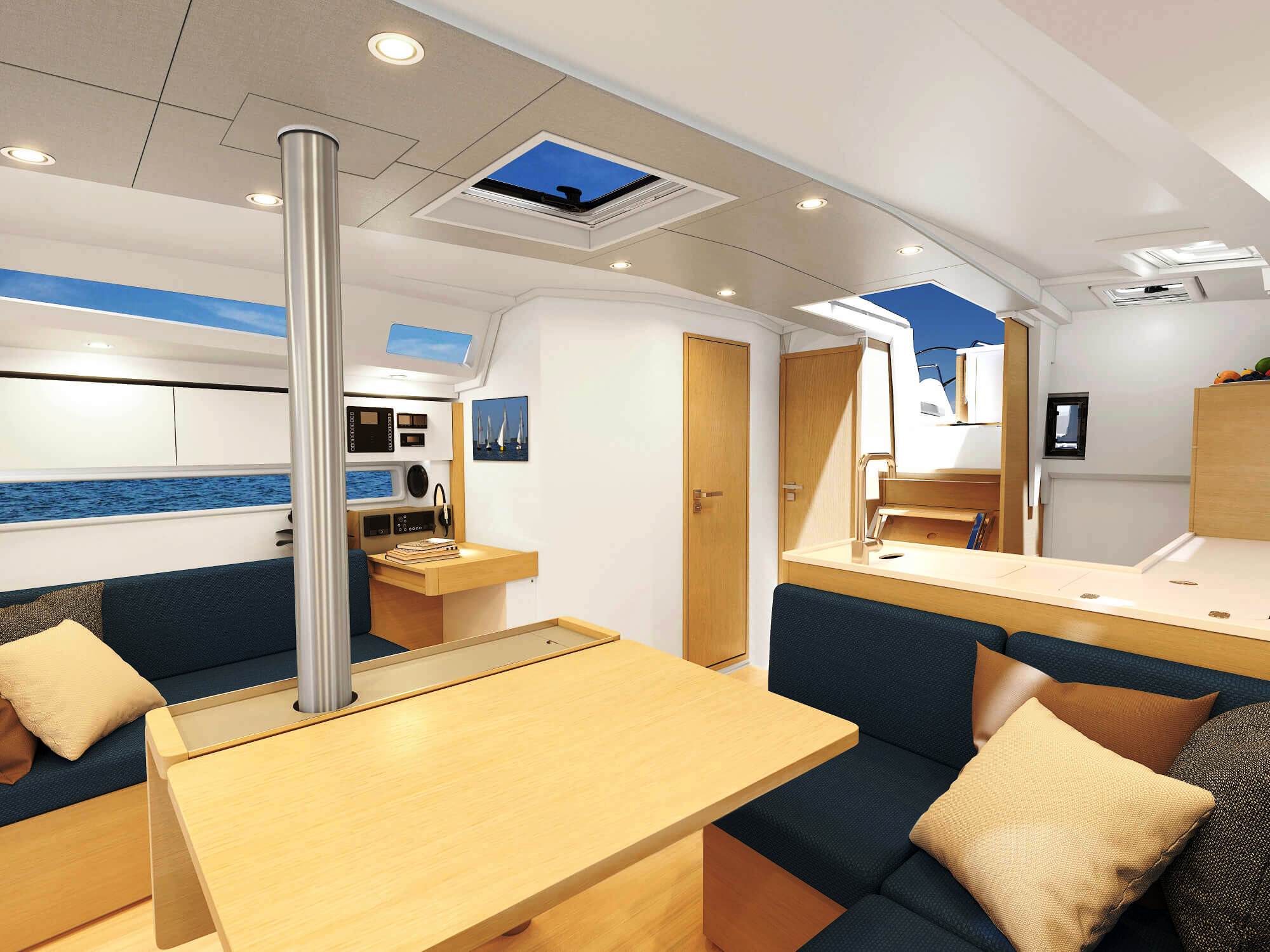 O gurupés opcional permite opções de navegação estendidas e, portanto, mais potência para o iate na água. O equipamento de desempenho opcional com uma área de vela maior permite um aumento adicional no desempenho.