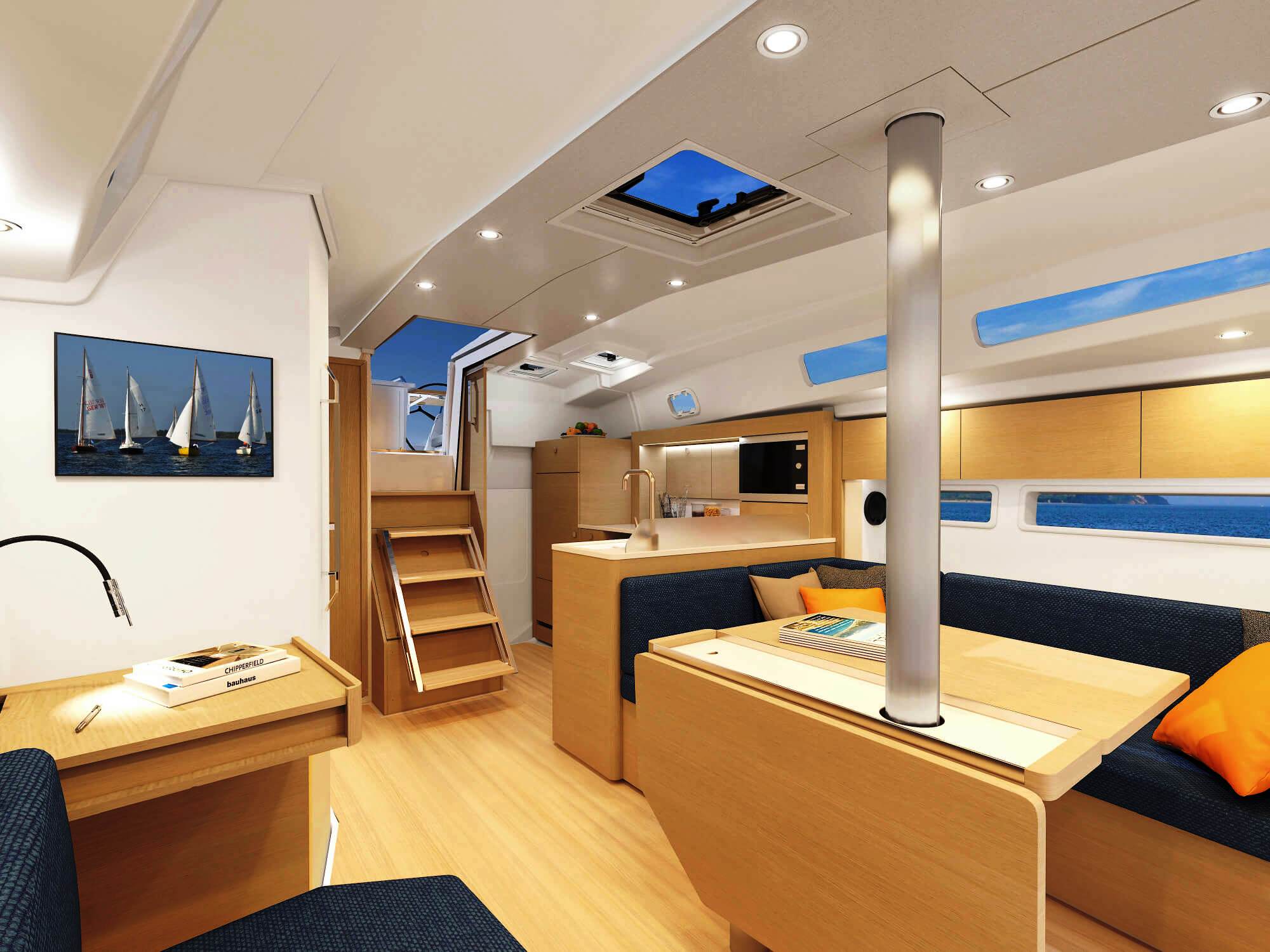 O design distinto da Hanse 360 com as típicas quinas da Hanse não só garante estabilidade e desempenho, mas também, como acontece com as suas irmãs maiores, uma enorme quantidade de espaço e, portanto, um nível de conforto invulgarmente elevado nesta classe.