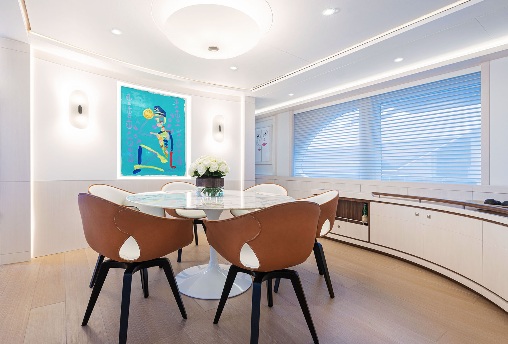 Sua decoração leve combina com os móveis selecionados junto com o proprietário de marcas como Wittmann, Giorgetti, Knoll e JAB.