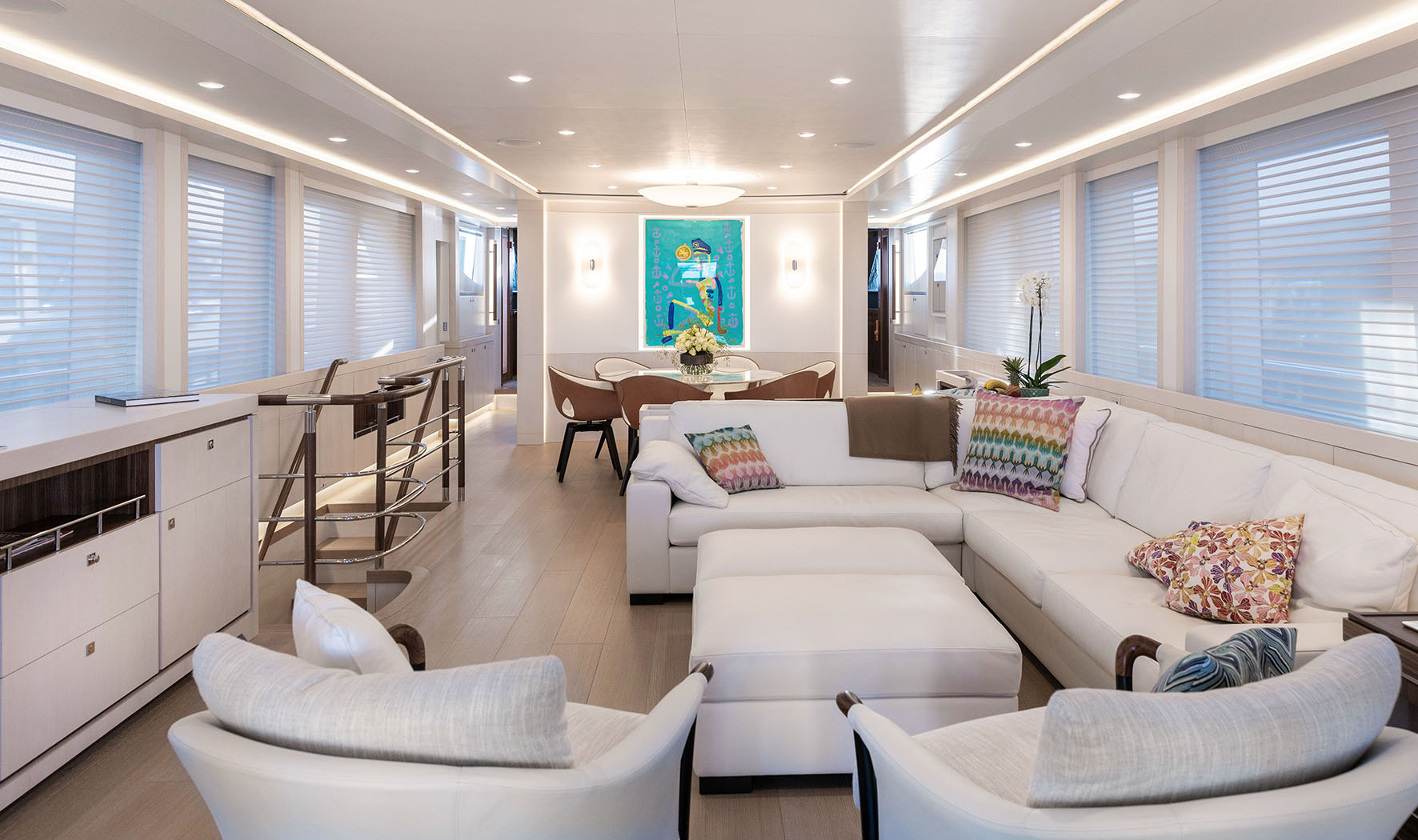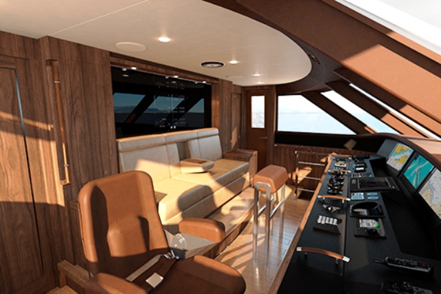 Uma segunda estação piloto pode ser encontrada no flybridge, que é totalmente dedicado à vida ao ar livre, com espreguiçadeiras, uma área de bar e uma área de refeições. A 5.5. A proposta é armazenada na plataforma de banho de popa.