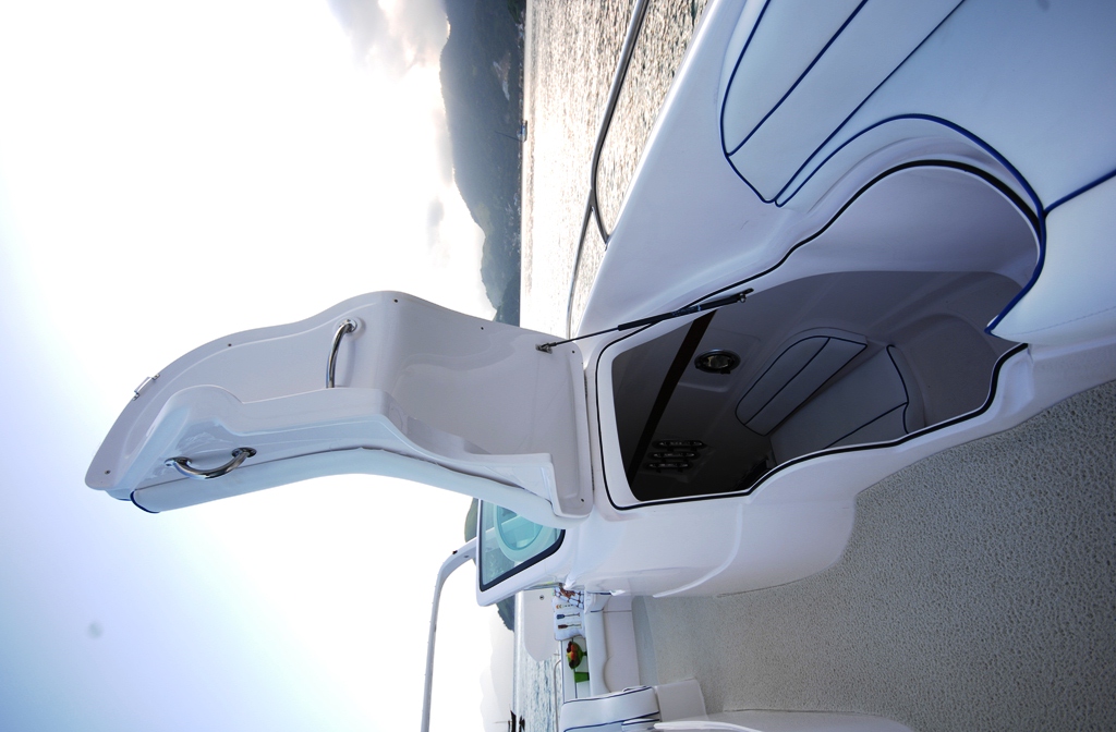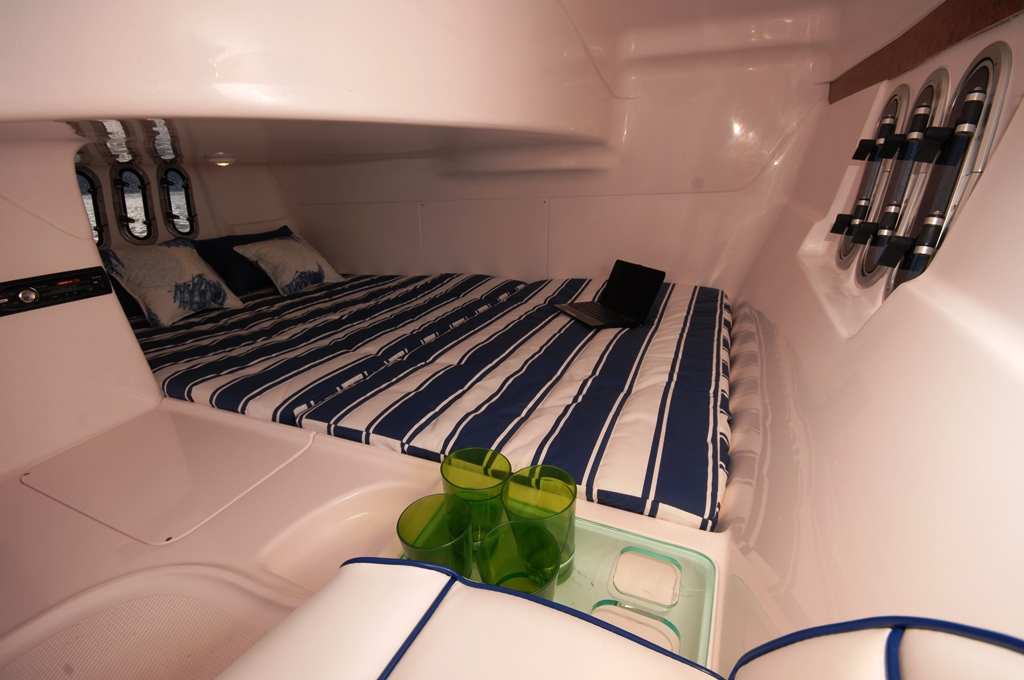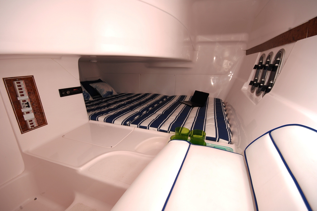 O acesso da cabine é no divã de proa de bombordo e o do banheiro é no divã de proa de boreste. Porém os dois se comunicam por dentro. A cabine tem uma confortável cama de meia-nau, sofá a bombordo com caixa sob o assento, duas vigias laterais para ventilação e iluminação e luminárias dicroicas no teto. O banheiro tem armário horizontal, bancada com lavatório e saboneteira embutida, tudo em fiber glass, ducha manual, espelho, sanitário marítimo embutido, uma vigia lateral para ventilação e iluminação, porta-papel, porta-toalha e iluminação com luminárias dicroicas no teto.