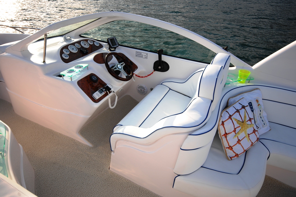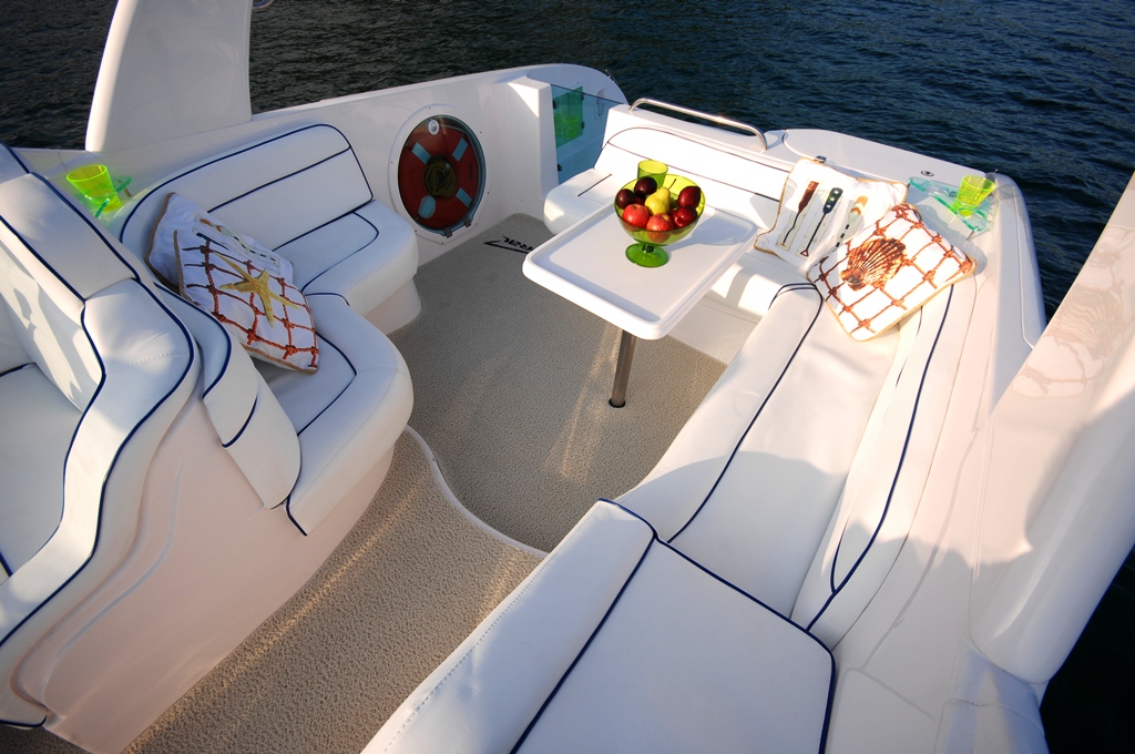 A lancha transporta até dez passageiros sentados no convés e dois no pernoite na cabine. Na popa, a plataforma tem caixas e tampas embutidas, ducha, console com pia e geleira e escada de acesso ao mar de aço inox embutida. A praça de popa tem sofá em L com caixa sob o assento e mesa de centro, bar com porta-garrafas e porta-copos e divã. Há também dois sofás na proa em formato de divã. A cabine de comando tem assento duplo anatômico para piloto e acompanhante, para-brisa frontal e lateral de vidro laminado de segurança.