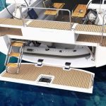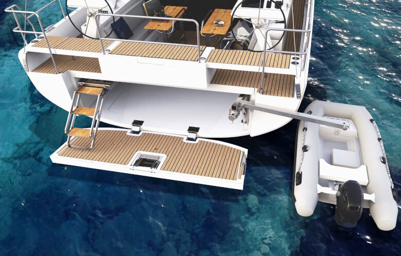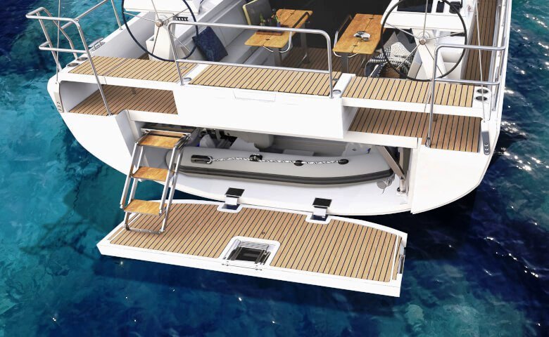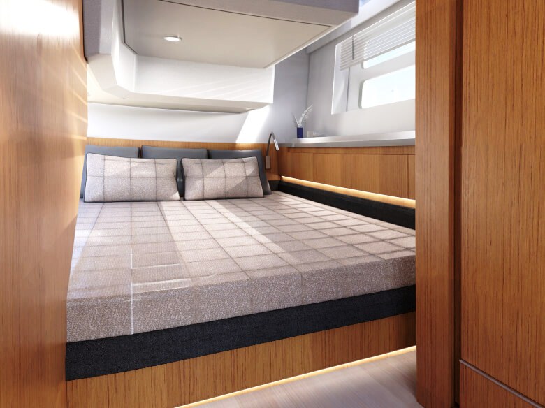 Os dois grandes armários na cabine podem ser usados para guardar tudo o que é necessário para uma longa viagem. A posição do timoneiro alto proporciona uma visão perfeita em todos os momentos. O acesso à plataforma de banho é feito através de uma escada confortável, e a partir daí você pode facilmente entrar na água através das escadas de banho opcionais.