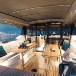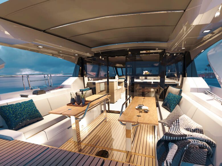 Sob a capota flexível que pode ser aberta, duas mesas de cockpit, áreas de assento generosas e outras opções de assentos na área traseira do cockpit proporcionam o cenário ideal para experiências compartilhadas com família e amigos. O bar molhado opcional na popa com churrasqueira, geladeira e pia contribui perfeitamente para a hospitalidade.
