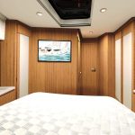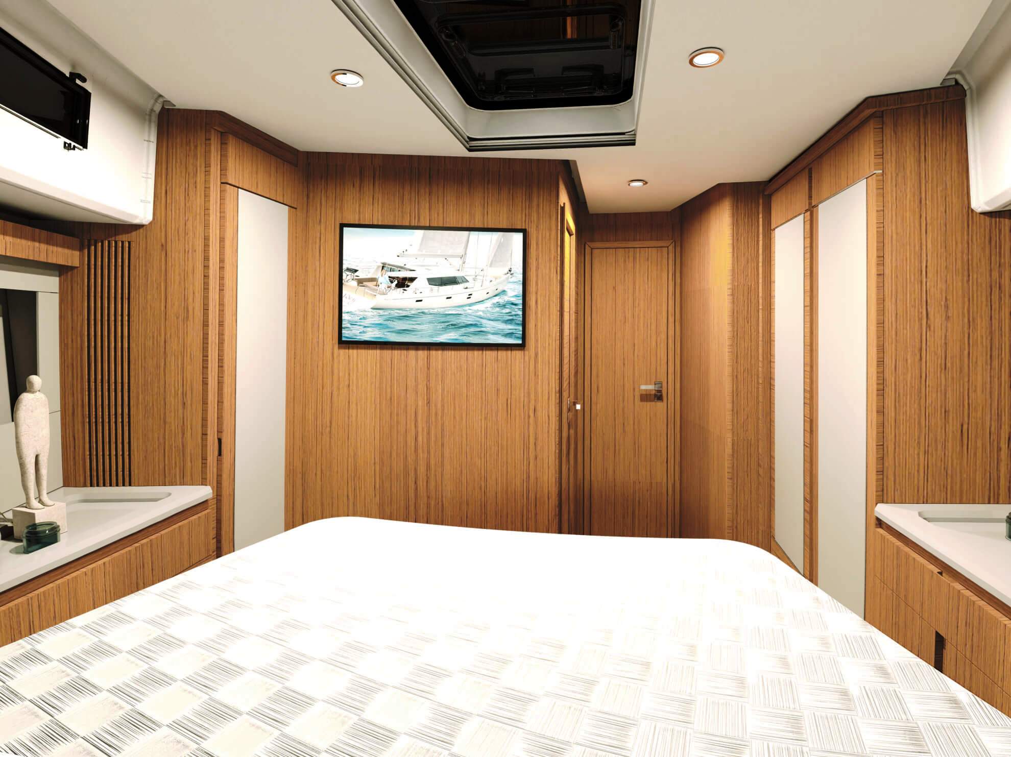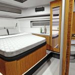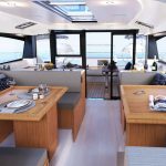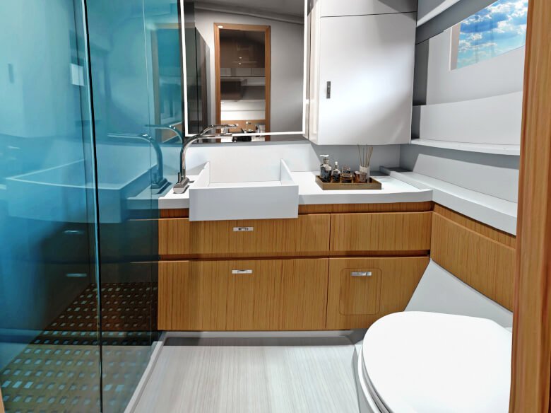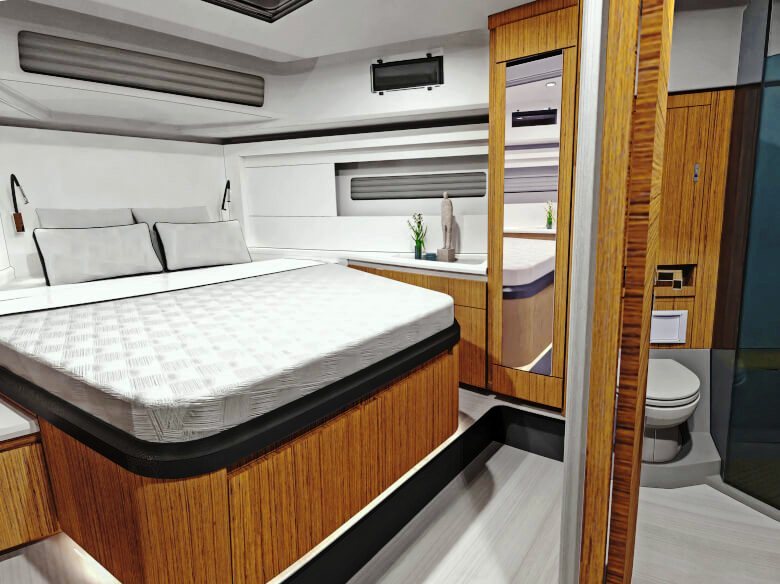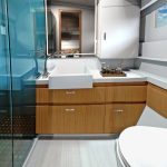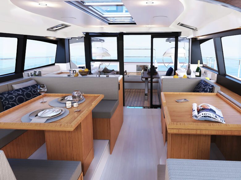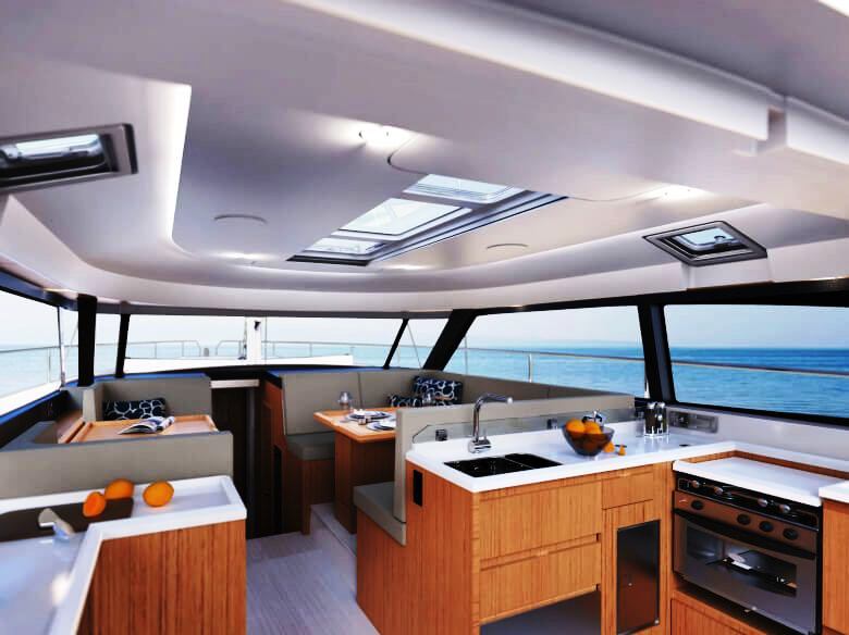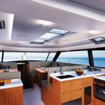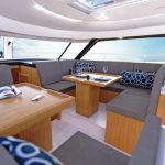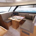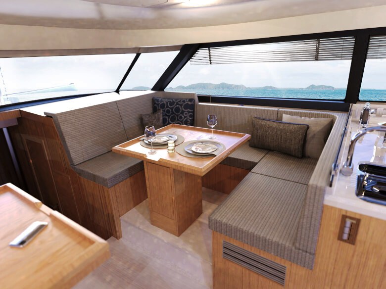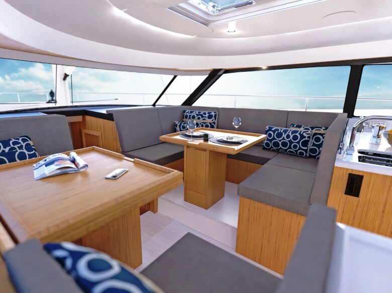 Salão de convés: Com suas janelas de vidro de segurança perfeitamente laminados, o salão oferece uma vista panorâmica de 360 graus, seja da ampla área de estar com mesa, da posição de direção opcional ou da espaçosa cozinha em forma de L com seu gás de três queimadores cooktop e bancada grande. Uma máquina de lavar louça, um frigorífico com capacidade até 380 litros e um forno micro-ondas estão disponíveis mediante pedido.