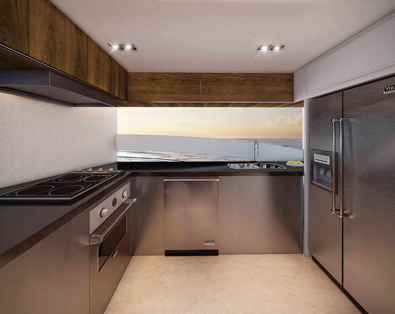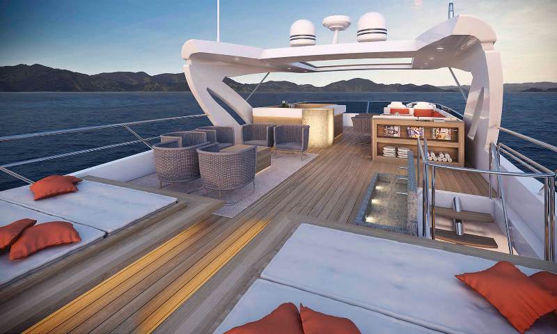 A plataforma de popa com lift hidráulico possui 2,40 metros de comprimento, sendo possível içar facilmente um bote ou jet-ski, ou até mesmo usá-la como uma praia particular a bordo. A passarela hidráulica é embutida, permitindo melhor aproveitamento do espaço.