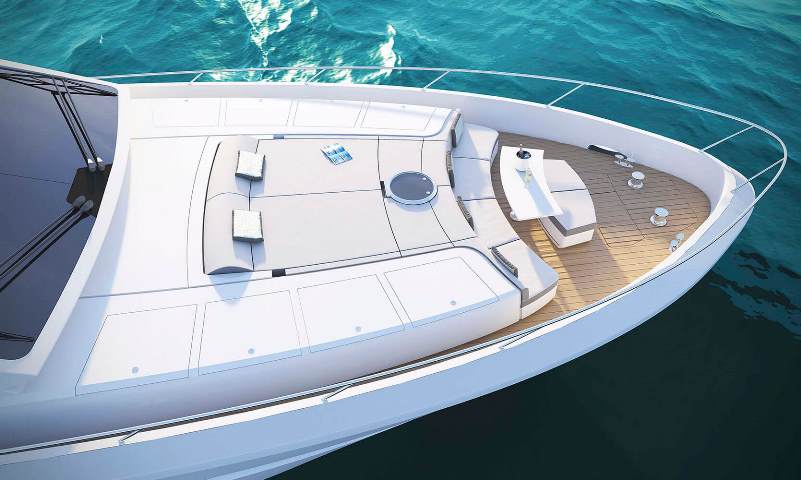 A proa é digna de um superyacht. Além do espaçoso solário, um sofá com mesa para refeições complementa o sofisticado ambiente.