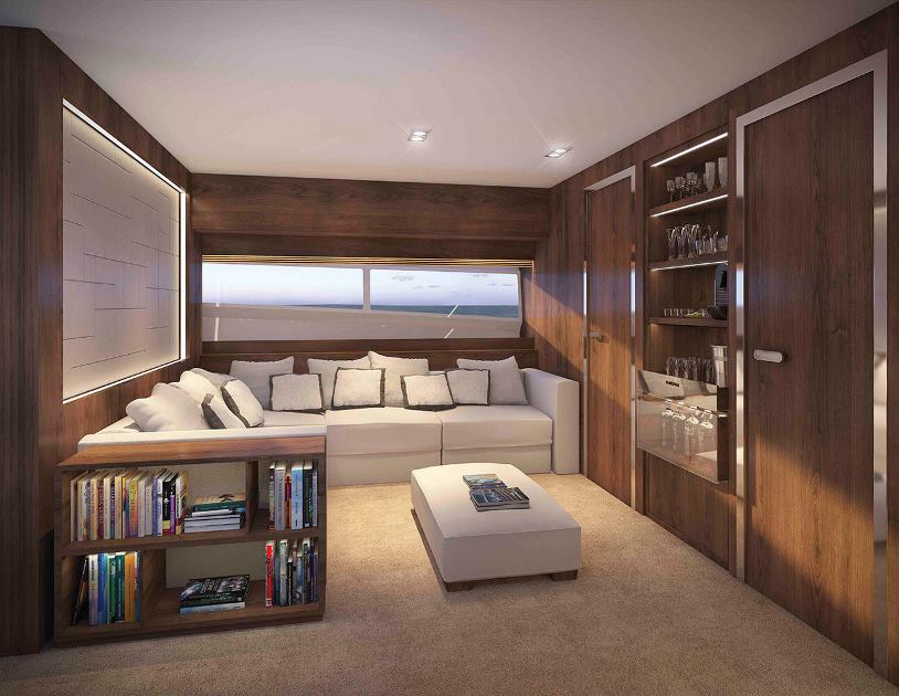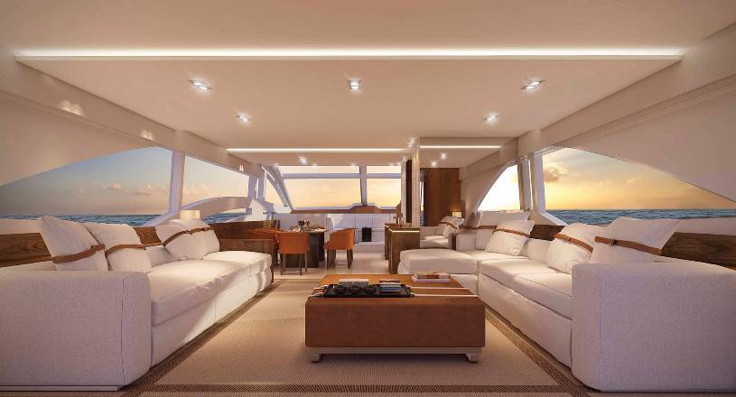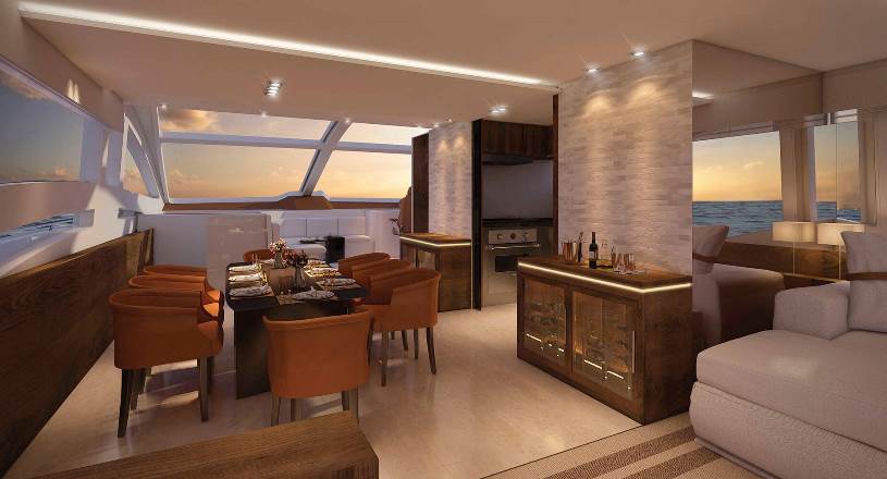 A sala de estar tem dois aconchegantes sofás e mesa de centro. A cozinha, à boreste, é completa e possui até mesmo uma geladeira side-by-side. Duas portas de vidro deslizantes a separam ou a integram com o restante do salão. A sala de jantar, a bombordo, acomoda oito pessoas confortavelmente. O posto de comando, agradável e seguro para navegação, conta com duas poltronas e dinette. O duplo para-brisas traz ainda mais luz natural e visibilidade para o interior. Duas portas nas laterais no salão permite o acesso ao passadiço, sendo que uma delas dá acesso ao lavabo, que também possui entrada por dentro do salão. O lavabo possui dois acessos para que os convidados, que mesmo estando molhados após um banho de mar, possam utilizar o banheiro sem precisar passar pelo salão. A porta do salão, com quatro folhas, abre-se amplamente para integrar-se com a praça de popa.