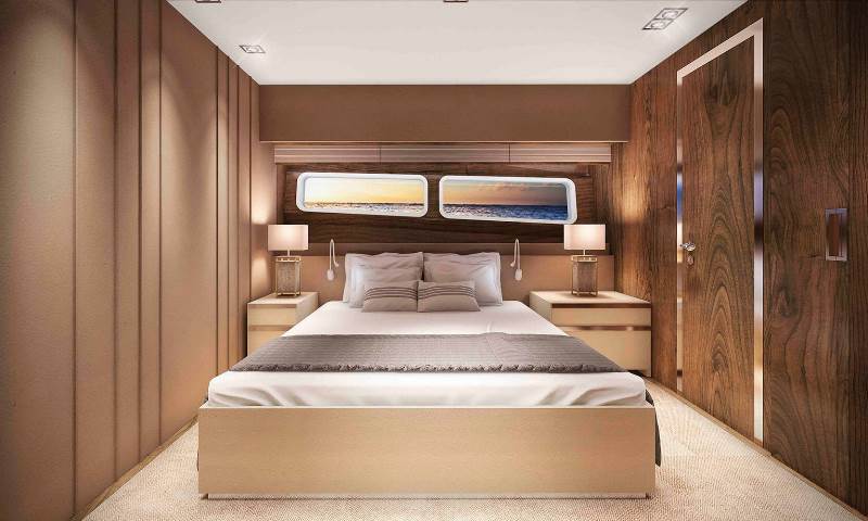 O deck inferior possui cinco confortáveis suítes. A suíte máster, localizada à meia-nau, possui cama king-size e amplas janelas com vista para o mar. Dispõe também de dois sofisticados banheiros, masculino e feminino, além de um grande closet. A suíte vip, localizada na proa, possui cama king-size. Outra suíte para casal, com cama queen-size, está localizada a boreste, logo em frente à escada que dá acesso ao deck inferior. E por fim, mais duas confortáveis suítes com camas de solteiro complementam as suntuosas acomodações para os convidados.