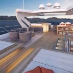 A praça de popa, concebida sob medida para o clima tropical, possui espaço para acomodar confortavelmente os convidados. O sofá em U com mesa para refeições e o elegante bar tornam o ambiente ainda mais prático.