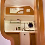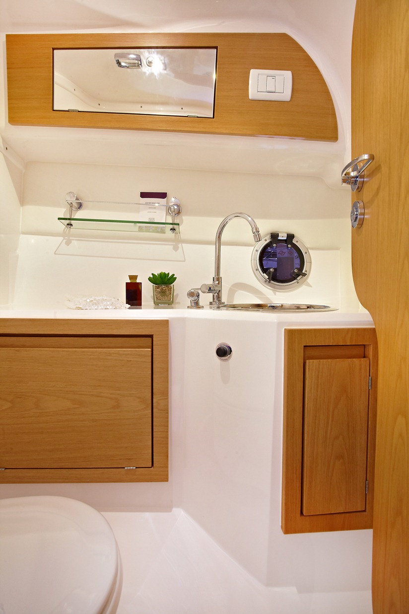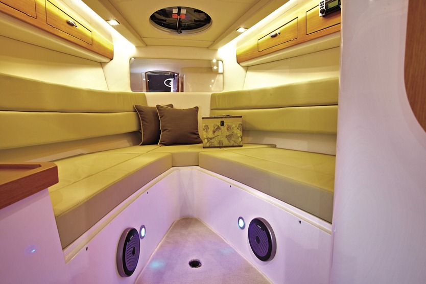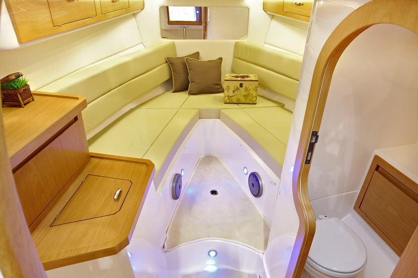 A cabine também ganhou na altura, mais quatro centímetros que deixaram o pé-direito com 1,83 m. Os sofás acompanham o V da proa e transformam-se em duas camas para pernoite. Há ainda armários na parte superior e um grande central. Logo abaixo da escada de acesso à cabine há uma cama que acomoda duas pessoas para a pernoite. No mesmo ambiente há um banheiro confortável, elétrico, com pia de inox e vários porta-objetos.