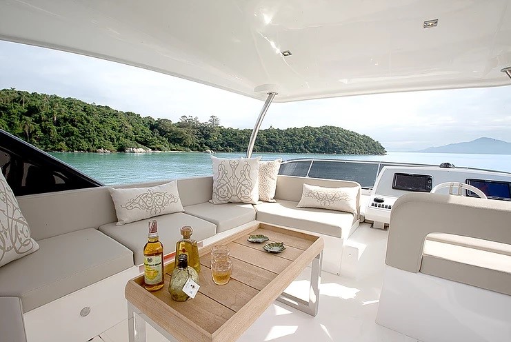 O flybridge é muito espaçoso e permite diferentes customizações. Conta com posto de comando externo com o tradicional volante e joystick, um hard top, um grande sofá em forma de “U” com uma mesa, solário, bar, geladeira e toldo transparente.