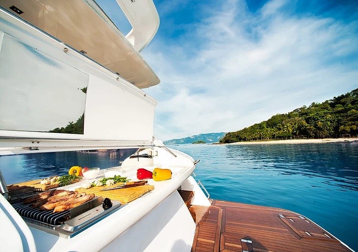 Bonita e elegante por fora, o visual da Schaefer 580 é um convite para o embarque. Uma plataforma hidráulica com uma escada embutida facilitam a entrada. De cara já se vê a área gourmet com churrasqueira, bancada e pia no acesso para a praça de popa que é bastante ampla, especialmente com o ganho da varanda lateral, quando aberta com acionamento hidráulico.