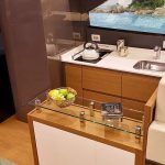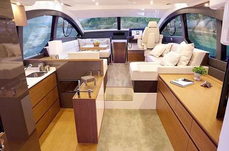 A amplitude dos ambientes da Schaefer 580 é surpreendente. O cockpit, muito bem iluminado pela entrada de luz natural, tem um sofá em formato de “U” com mesa. Mais à frente um outro sofá que fica bem atrás do posto de comando. A cozinha completa, com cuba embutida em aço inox e misturador de água quente e fria, fogão cooktop com suporte para panelas, forno micro-ondas, geladeira, armário com gavetas e suporte para copos, taças e pratos, fica posicionada entre o deck e a sala integrando os espaços.