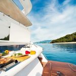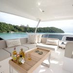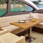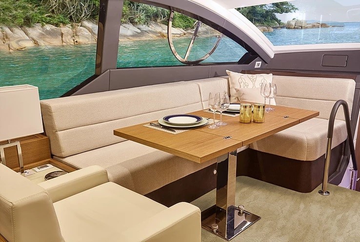 Há espaço suficiente para um grande sofá em forma de “L” com mesa de madeira. O deck de popa totalmente abrigado pela cobertura do fly acomoda confortavelmente seis pessoas sentadas em volta da mesa.
