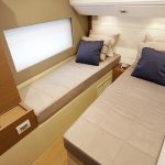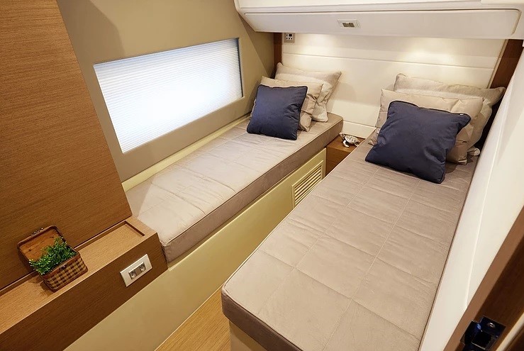 A terceira cabine fica a boreste com duas camas de solteiro com complemento para cama de casal, armário com prateleiras e piso em carpete.