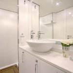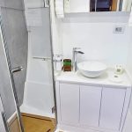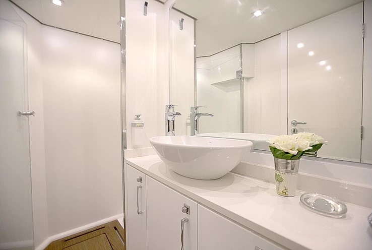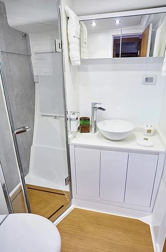 Os banheiros das suites master e VIP tem bancada com cuba de apoio em cerâmica e misturador de água quente e fria, armário com espelho, toalete elétrico, suporte para toalhas, piso em madeira, box com porta de vidro, acabamentos em aço inox e chuveiro com ducha