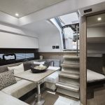 Outro diferencial da embarcação é que o proprietário pode decidir entre duas configurações de cockpit. A clássica, com amplo solário e garagem para bote. Ou a versão com duplo cockpit, com duas mesas que podem acomodar até 12 pessoas para o almoço.